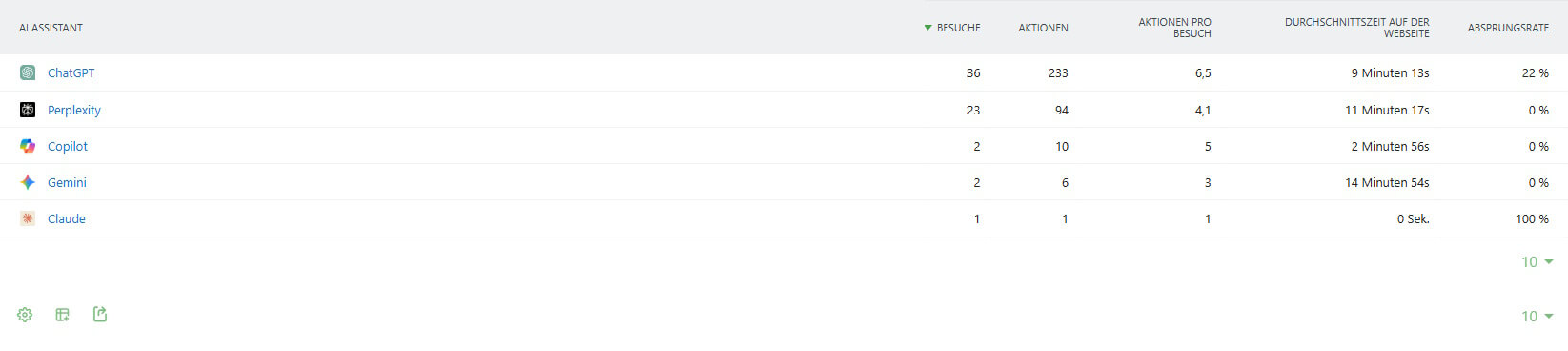 Du erkennst in vielen Tools für Webanalytics zwar, welche KI-Assistenten dir wie viel Traffic gebracht haben und auf welchen Seiten diese Besucher gelandet sind. Aber ein echtes Pendant zu einer Keyword-Auswertung, wie du sie im SEO-Bereich durchführen kannst und solltest, hast du so noch nicht.