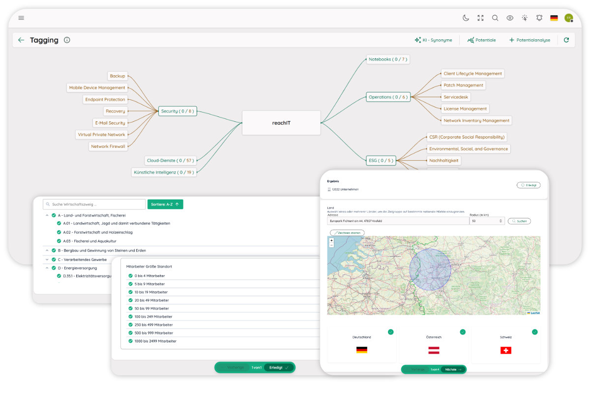 Selektieren Sie relevante Unternehmen nach Kaufphase, Thema und Quelle. Firmografische Stammdaten wie Mitarbeiterzahl, Branche und Region helfen Ihnen, Ihren Zielmarkt präzise zu bewerten.